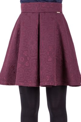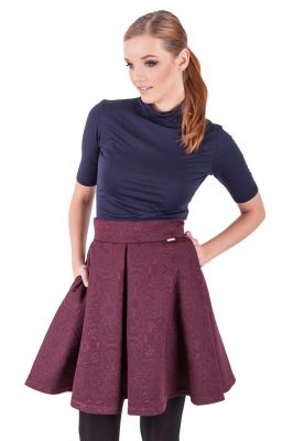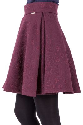 Mocno rozkloszowana spódnica z kontrafałdami, w kolorze wina. Posiada żakardowy, kwiatowy wzór oraz kieszenie ukryte w bocznym szwie.