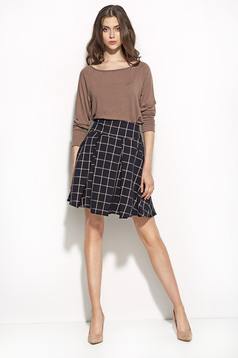 Lekko rozkloszowana spódnica w kolorze granatowym w kratę. Na przodzie ozdobna kontrafałda. Spódnica idealna na wiele okazji.