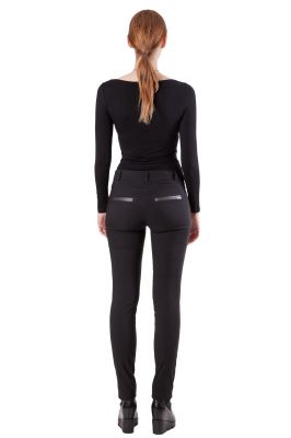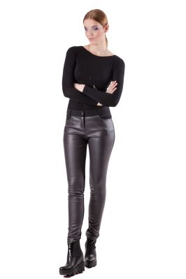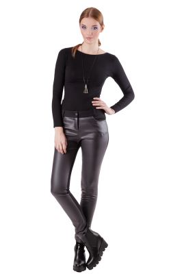 Czarne dzianinowe spodnie, z dopasowanymi nogawkami oraz przodem wykonanym z eko-skóry. Z przodu spodni znajdują się dwie wpuszczane kieszenie.
