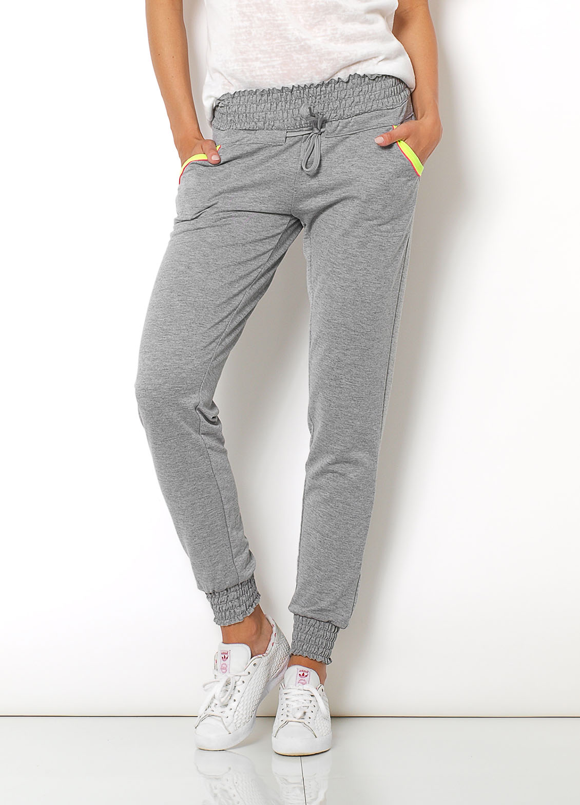 Sportowe dresy, drapowane w pasie i na dole nogawek, w pasie sznureczek do regulacji, obwódki kieszeni zestawione w kontrastowych kolorach do całości.Materiał 65% bawełna, 30% poliester, 5% elastan.Modelka wzrost 172cm, na co dzień nosi S/M, rozmiar z prezentacji produktu M.