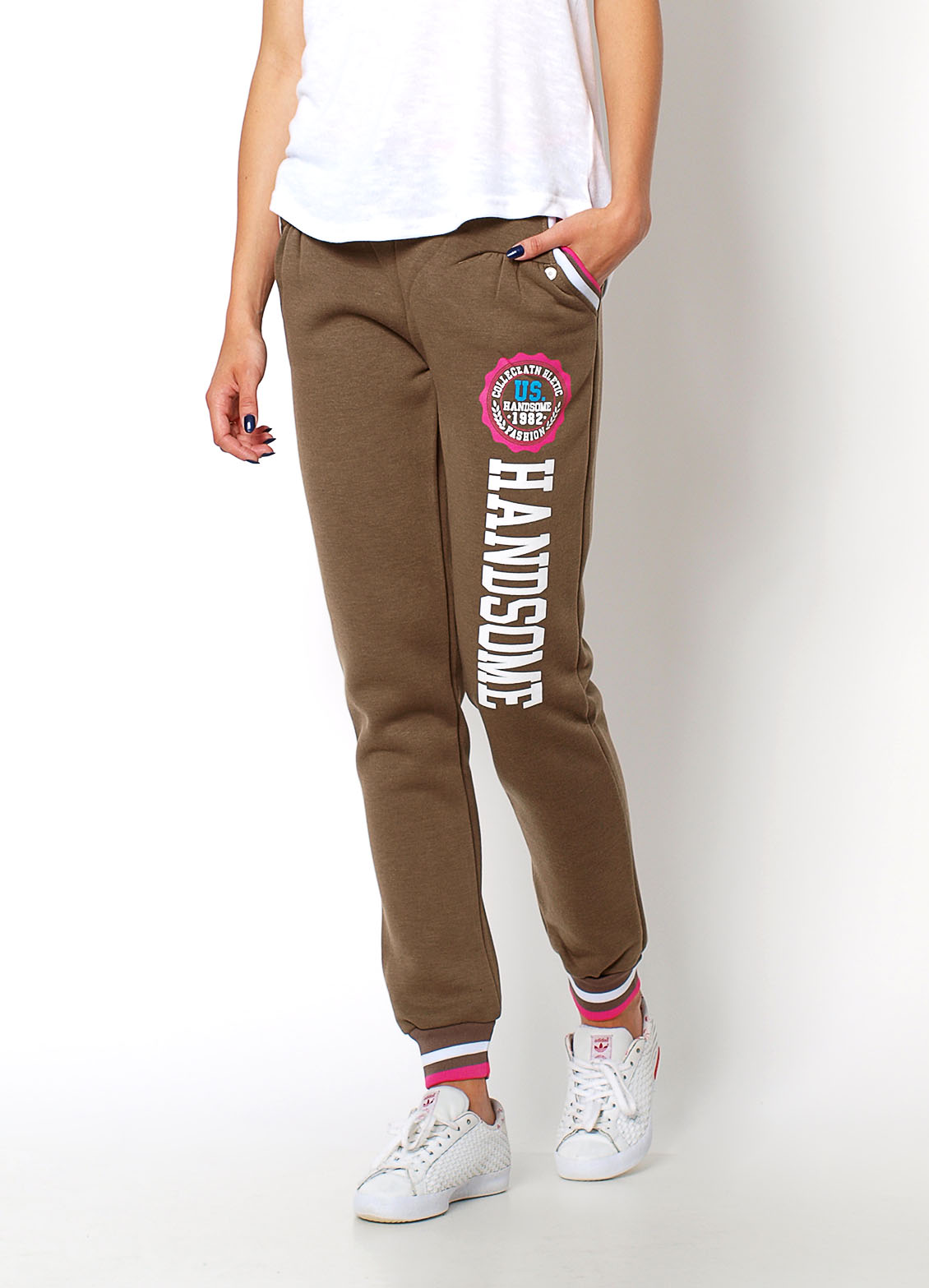 Grube dresy, wewnątrz z meszkiem, przy nogawkach ściągacze, w pasie gumka i sznurek do regulacji, po bokach kieszenie, na lewym udzie aplikacja w kontrastowym kolorze, z przodu przy kieszeniach delikatne drapowania.Materiał 65% bawełna, 35% poliester.Modelka wzrost 172cm, na co dzień nosi S/M, rozmiar z prezentacji produktu M