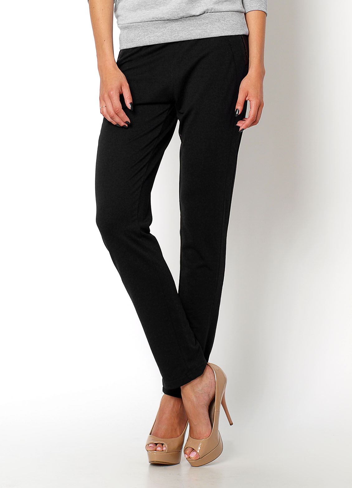 Spodnie dresowe, w pasie gumka i sznurek do regulacji, przy imitacjach kieszeni z przodu i z tyłu wstawki z materiału a'la skóra. Materiał 65% bawełna, 30% poliester, 5% elastan.Modelka wzrost 172cm, na co dzień nosi S/M, rozmiar z prezentacji produktu M/L