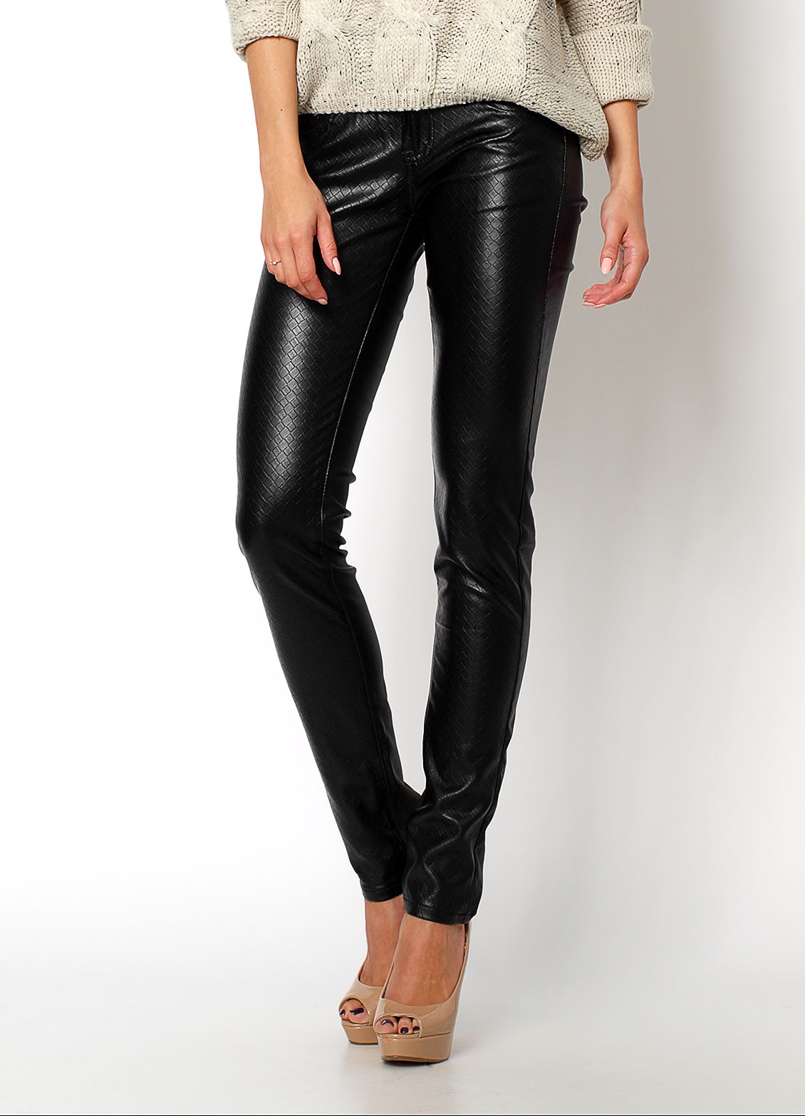 Spodnie ekoskóra, z przodu wytłaczany wzór kratki, z tyłu wzór gładki, w pasie szlufki, zapinane na guzik i zamek, z przodu i z tyłu kieszenie.Materiał 95% bawełna, 5% spandex.Modelka wzrost 172cm, na co dzień nosi S/M, rozmiar z prezentacji produktu M/38