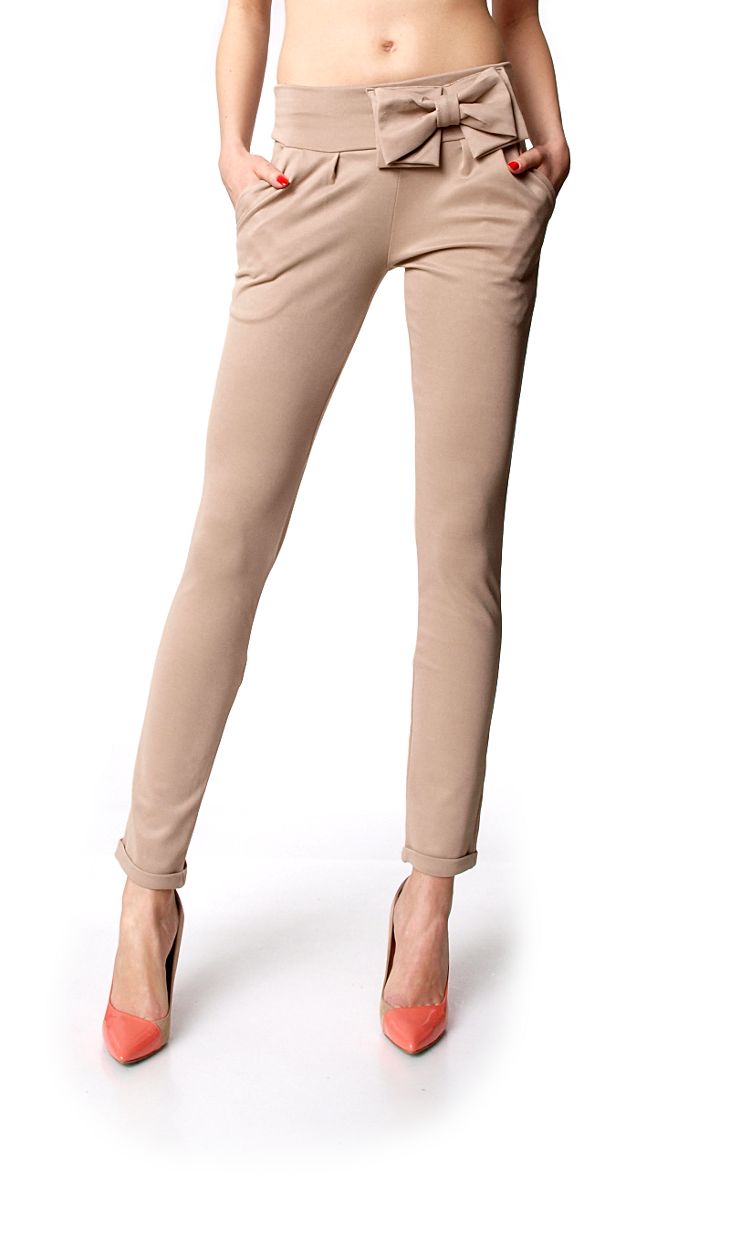 Stylowe spodnie na elastycznej gumce. Wykonane z półmatowego materiału spodnie z dużą, ozdobną kokardą na pasie. Z przodu delikatnie drapowane. Kieszenie z przodu (z tyłu imitacja kieszeni). Nogawki proste, zakończone delikatną zakładką. Modne, oraz bardzo wygodne. Idealnie sprawdzą się w eleganckich stylizacjach. Skład: 65% bawełna, 35% poliester.