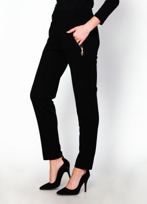 Ciemne elastyczne spodnie o pikowanej strukturze, w klasycznym kolorze czerni. W pasie guma. Lekko podwyższony stan. Z przodu kieszonki zapinane na ozdobny jasny zamek.Ciemne spodnie to trend ponadczasowy i doskonały wybór na jesień-zimę. Klasyczne rurki z modną pikowaną strukturą idealnie wpasują się w eleganckie jak i luźniejsze stylizacje. Z pewnością staną się ulubioną pozycją w szafie modnej kobiety. Spodnie na sylwetce prezentują się bardzo atrakcyjnie, ładnie dopasowując się i wysmuklając. Pasują do wszystkiego i są komfortowe w noszeniu. Z modnym zestawem dodatków świetnie sprawdzą się w każdej sytuacji - do codziennego stylu casual, stroju sportowego oraz eleganckich outfitów np. ze szpilkami.Materiał 65% bawełna, 35% poliesterModelka wzrost 175cm, na co dzień nosi rozmiar S/M