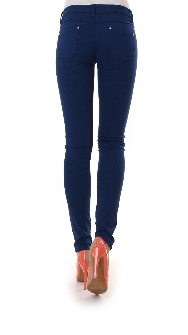 Klasyczne, granatowe spodnie typu rurki. Bawełniane spodnie zapinane na zamek oraz guzik. Wyszczuplające bryczesy z kieszeniami z przodu oraz z tyłu, z nitami zdobionymi błyszczącymi cyrkoniami. Modne, bardzo komfortowe spodnie.Skład: 95% bawełna, 5% elastan