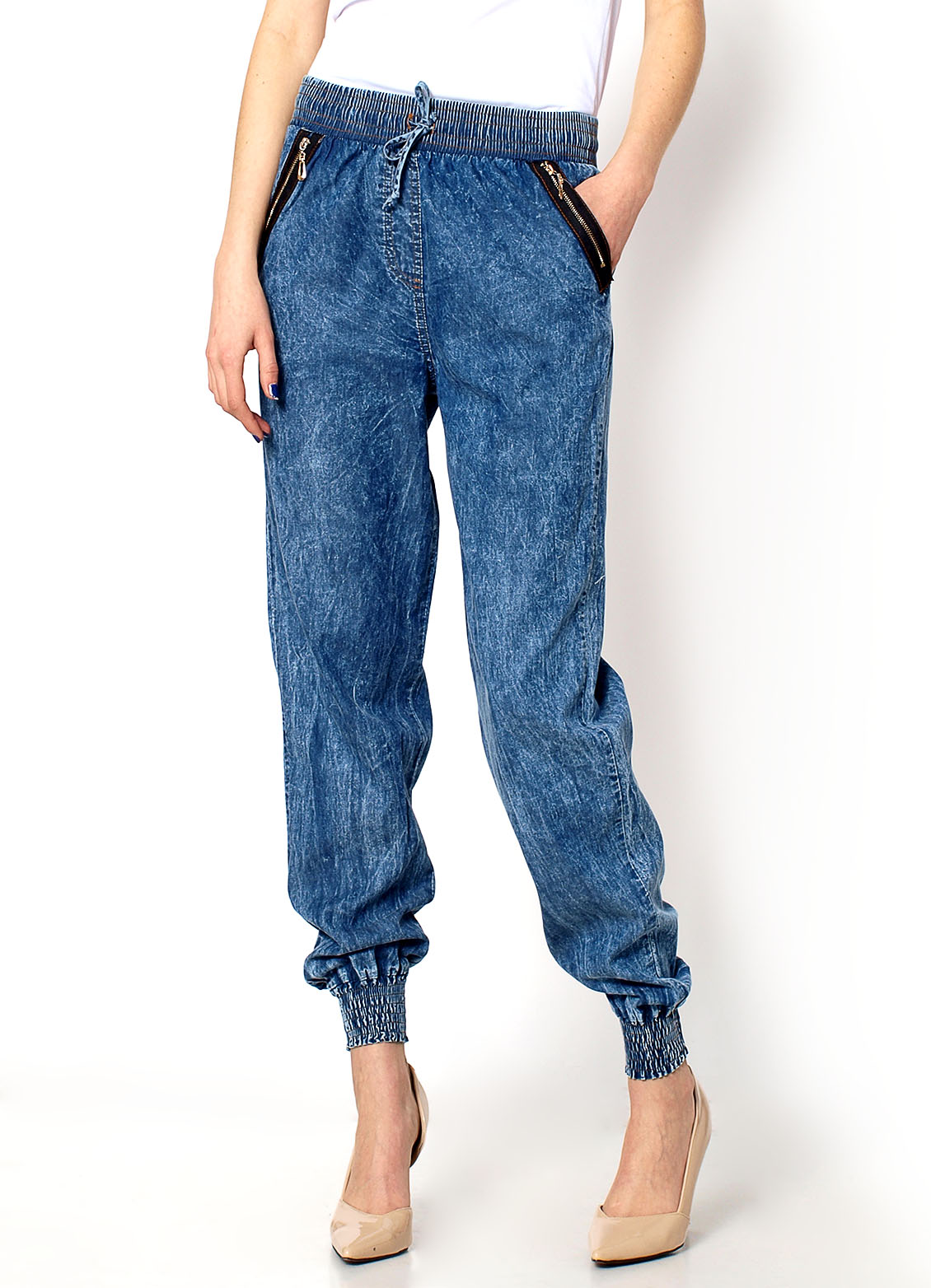 Spodnie jeans ze ściągaczami na dole nogawki, szersza nogawka, w pasie gumka i sznurek do regulacji, obniżony stan, kieszenie z przodu i z tyłu, miękki jeans. Materiał 100% bawełnaModelka wzrost 175cm, na co dzień nosi S/M, rozmiar z prezentacji produktu 36/S