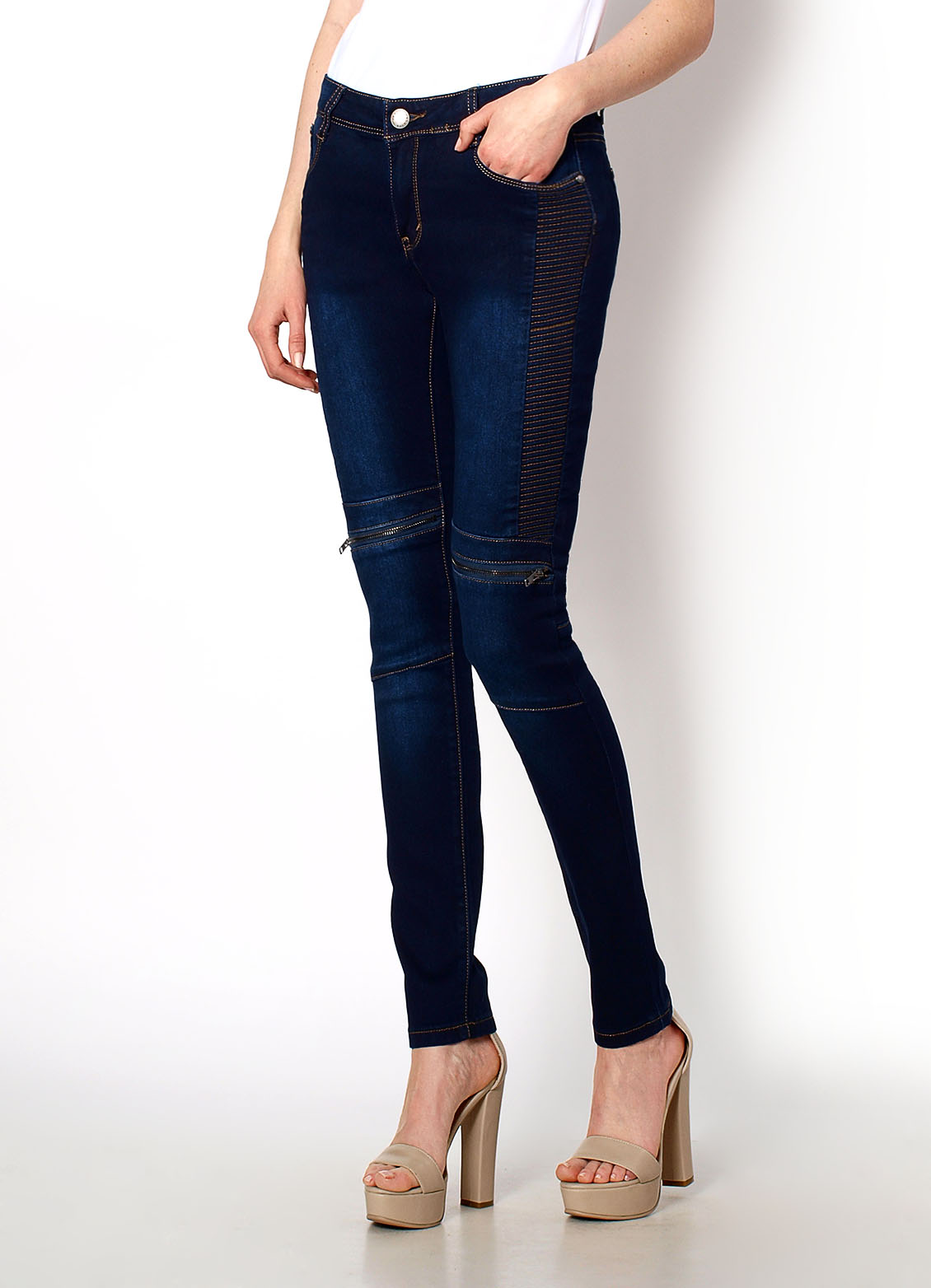 Jeansy zapinane na guzik oraz zamek, w pasie szlufki. Z przodu oraz z tyłu kieszenie, nogawki zwężane. Na udach przeszycia, na kolanach ozdobne suwaki. Materiał: 70% bawełna, 28% poliester, 2% elastan.Modelka: wzrost 175 cm.