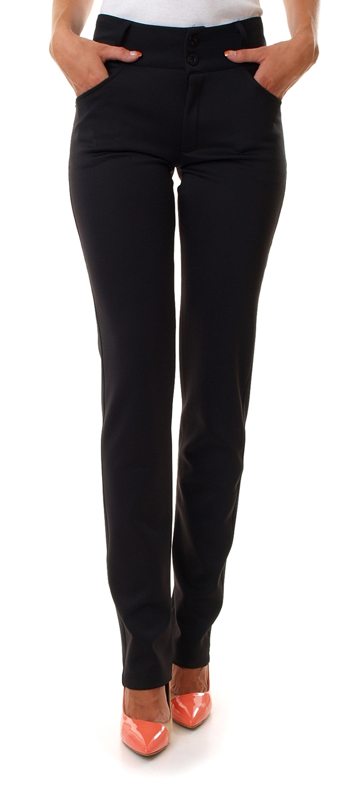 Klasyczne spodnie z prostymi nogawkami. Kieszenie z przodu. Z tyłu ozdobna imitacja kieszeni. Przy kieszeniach zdobione srebrnymi nitami. Doskonałe nawet do formalnej stylizacji. Wykonane z półmatowego materiału. Skład: 65% bawełna, 35% poliester