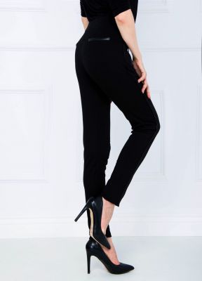 Spodnie typu tregginsy na gumie w klasycznych kolorach: czerń, granat i grafit. Wykonane z grubszego przyjemnego dla ciała materiału. W pasie na elastycznej gumce. Imitacje kieszeni z przodu i na pośladkach, wykończone lamówką w kolorze czarnym. Nogawki zwężane - typowe rurki, ładnie przylegające do ciała, podwyższony stan. Dostępne w trzech kolorach do wyboru.Zwężane spodnie to klasyka w damskiej garderobie, a urozmaicenie modną lamówką przyciągnie spojrzenia. Tregginsy to pośrednia forma między legginsami i spodniami. Są tak samo obcisłe i dopasowane do figury, jak tradycyjne legginsy, ale są wykonane z grubszego materiału, co przybliża je do jeansów. Ładnie wymodelują sylwetkę. Klasyczne kolory i fason pozwolą na dobór dowolnych dodatków i dopasują się do każdego stylu, są idealne na każdą porę roku.Materiał 95% bawełna, 5% lycraModelka wzrost 170cm, na co dzień nosi rozmiar S
