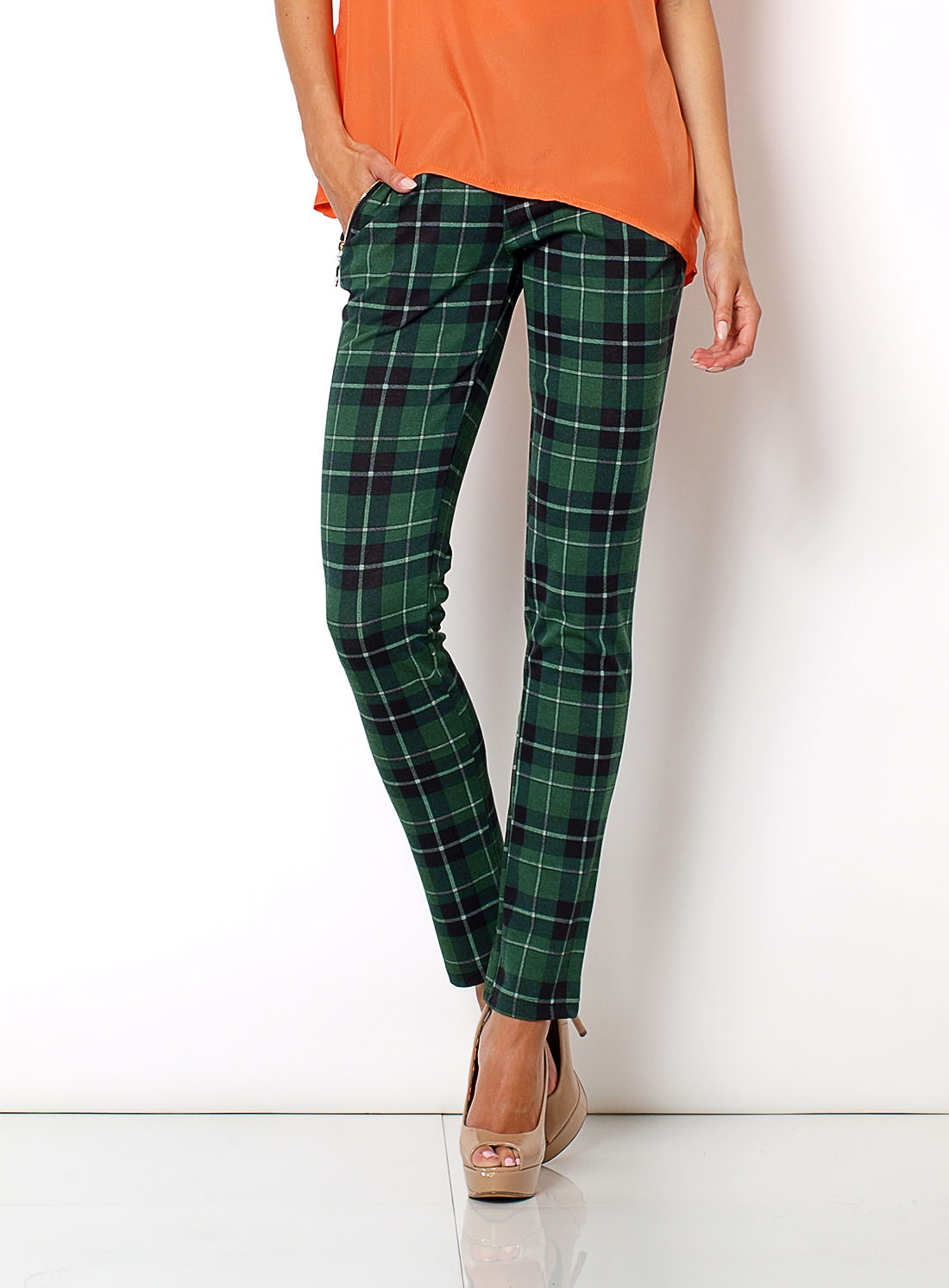Spodnie w kratkę, w pasie posiadają gumkę, z przodu kieszenie na zamek. Różne kolory.Materiał 35% bawełna, 65% poliester.Modelka wzrost 172 cm, na co dzień nosi S/M, rozmiar z prezentacji produktu M.