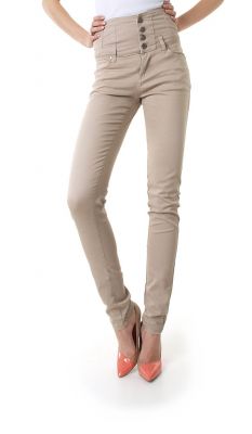 Super modne beżowe jeansy z wysokim stanem. Spodnie typu rurki z kieszeniami z przodu, oraz z tyłu. W pasie szlufki. Zapinane na zamek oraz cztery guziki. Wysoki pas sprawia, że ładnie dopasowują się do talii, rewelacyjnie ją wyszczuplając. Bardzo wygodne i komfortowe. Struktura spodni, gnieciona z możliwością wyprasowania, jak w prezentacji produktu. Skład: 98% bawełna, 2% elastan