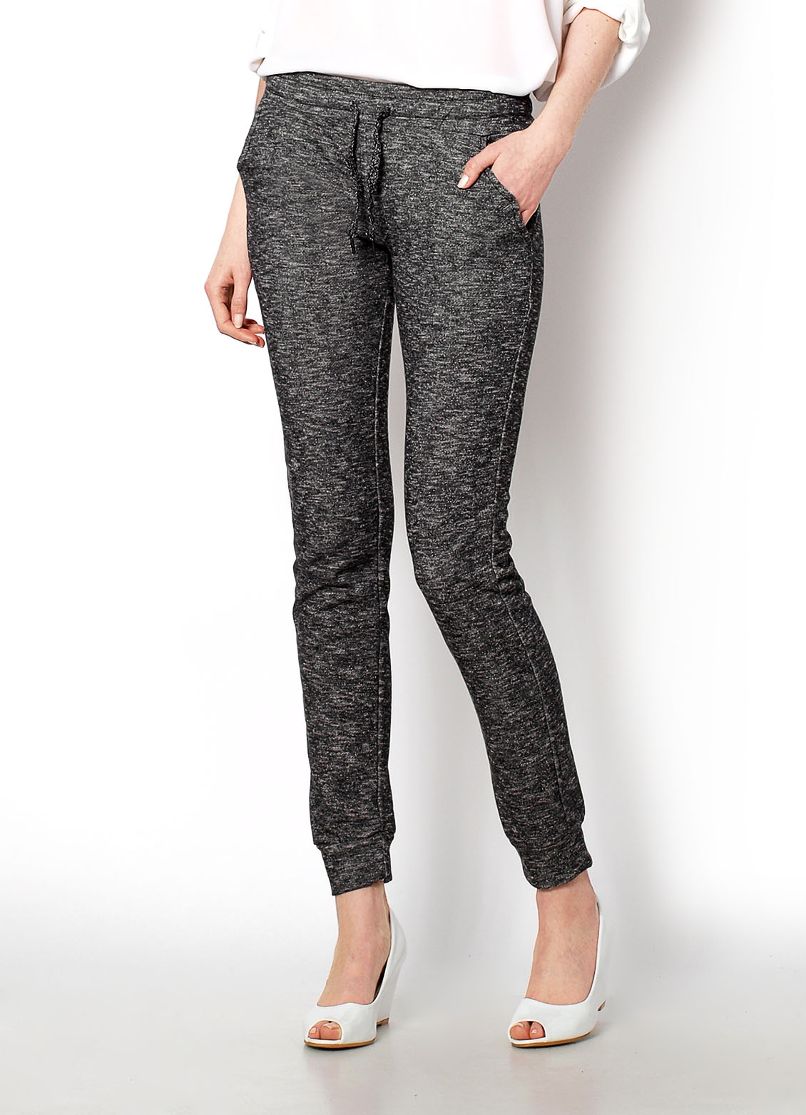 Melanżowe spodnie z bezuciskowymi ściągaczami na nogawkach. W pasie elastyczna gumka i sznureczek do regulacji. Z przodu wsuwane kieszenie zapinane na guziczek, na pośladkach ich imitacje. Zapewniają komfort i swobodę ruchów podczas noszenia. Materiał 65% bawełna, 35% poliester.Modelka wzrost 175cm, na co dzień nosi S/M, rozmiar z prezentacji produktu S