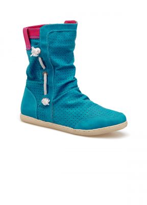 Sportowe botki na białej gumowej podeszwie, wstawki w kontrastowym kolorze, noski okrągłe. Po wewnętrznej stronie buta zamek, z zewnętrznej strony ozdobny sznurek.