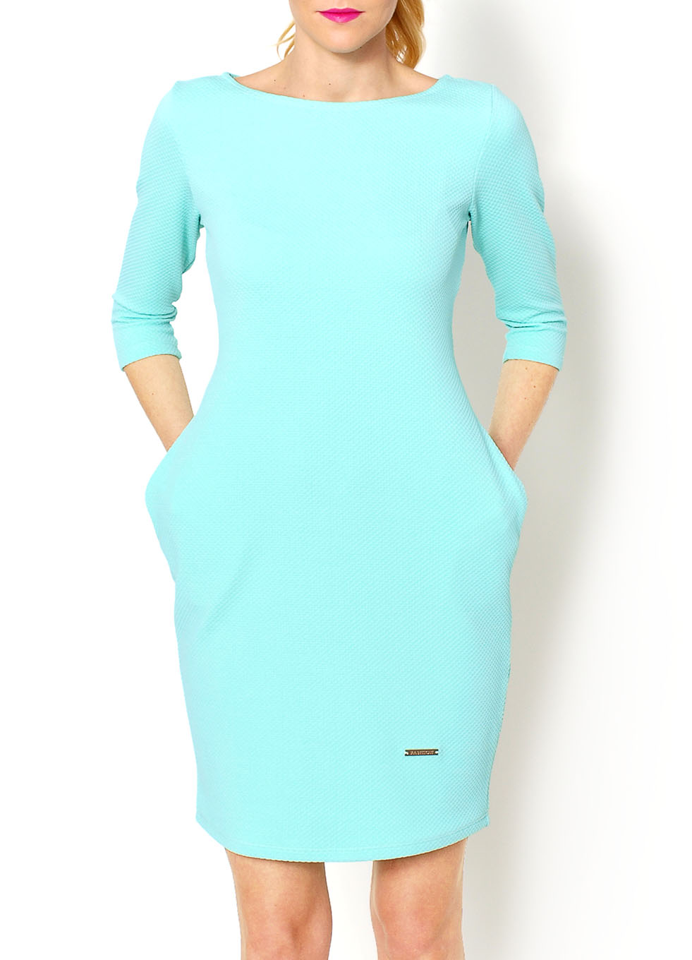 Sukienka, rękaw 3/4, dekolt okrągły, po bokach wsuwane kieszenie, fason bombki - szerszy w biodrach, materiał z drobna pikowaną fakturą. Materiał 95% bawełna, 5% lycra.Modelka wzrost 175cm, na co dzień nosi S/M, rozmiar z prezentacji produktu M