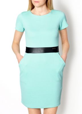 Sukienka z krótkim rękawem. Wykonana z materiału o pikowanej fakturze. W talii zdobiona wstawką z eco skóry. Z tyłu wcięcie. Zapinana na kryty suwak na plecach. Dekolt okrągły. Zaznaczona linia bioder, kieszenie wsuwane. Materiał 95% bawełna, 5% lycraModelka wzrost 175cm, na co dzień nosi S/M, rozmiar z prezentacji produktu M