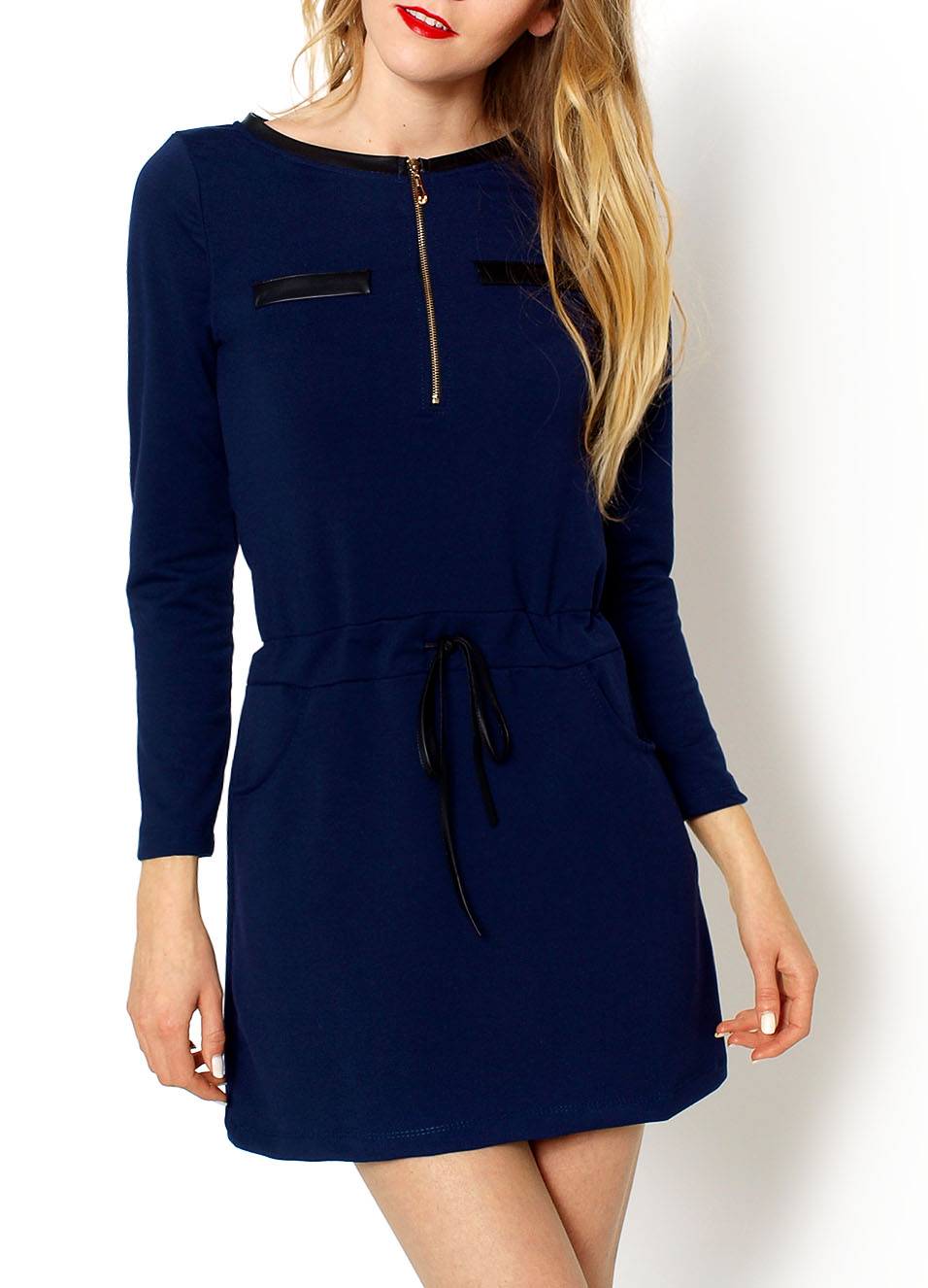 Sukienka dresowa, długi rękaw, na piersiach imitacje kieszeni, dekolt z rozpinanym zamkiem, lamówka wokół dekoltu i kieszeni z ekoskóry, w talii ściągacz.Materiał 35% bawełna, 65% poliester.Modelka wzrost 175cm, na co dzień nosi S/M, rozmiar z prezentacji produktu M