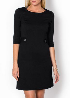 Sukienka typu trapez, z dopasowaną górą, lekko rozszerzana ku dołowi. Rękawki o długości 3/4 oraz okrągły dekolt. Na plecach zapinana na kryty suwak. W talii po bokach zdobiona guzikami.Rewelacyjny materiał o wytłaczanej fakturze, będzie świetną alternatywą dla gładkich tkanin.Dobrze dopasowuje się do ciała i podkreśla wszystkie atuty sylwetki. Odpowiednia długość ładnie wyeksponuje nogi.Materiał 95% bawełna, 5% lycraModelka wzrost 175cm, na co dzień nosi rozmiar S/M