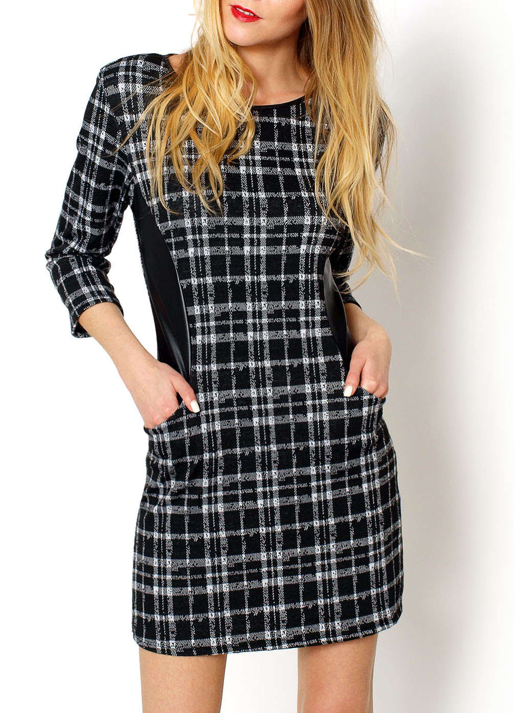 Sukienka/tunia, wzór kratka, fason tuby, rękaw 3/4, po bokach w talii wstawki z ekoskóry, po bokach kieszenie, dekolt okrągły z lamówką, z tyłu zapinana na guzik z wycięciem łezki.Materiał 95% poliester, 5% elastanModelka wzrost 175cm, na co dzień nosi S/M, rozmiar z prezentacji produktu uniwersalny