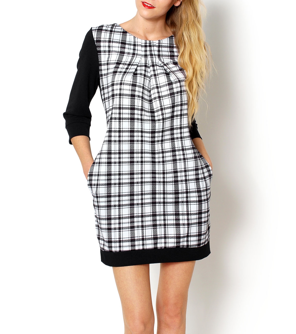 Sukienka, z przodu kratka, tył i rękawy gładkie i jednolite, z tyłu krótki rozpinany zamek, fason bombki, dekolt okrągły, rękaw 3/4, na dekolcie drapowania, luźny krój, rękawy zakończone mankietem. Materiał 95% poliester, 5% elastan.Modelka wzrost 175cm, na co dzień nosi S/M, rozmiar z prezentacji produktu uniwersalny
