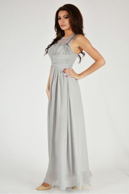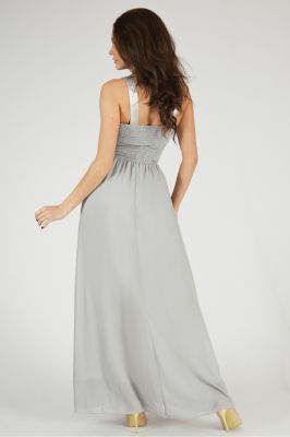 Długa sukienka z gorsetową górą w kolorze szarym. Dekolt ozdobiony siateczką i koralikami.