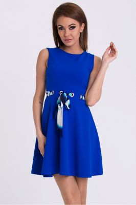 Prosta sukienka bez rękawków w kolorze kobaltowym. Dół lekko rozkloszowany, w talli szarfa do wiązania. Idealna propozycja na wiele okazji.