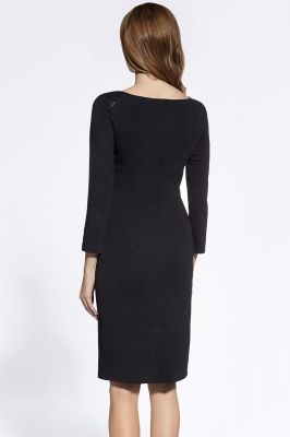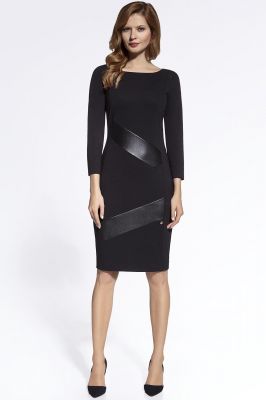 Elegancka sukienka midi, ładnie dopasowująca się do ciała. Dekolt w łódkę. Rękaw długi. Przód sukienki zdobią wstawki z czarnej skóry. Sukienka na podszewce, zapinana z tyłu na suwak. Model na każdą okazję.
