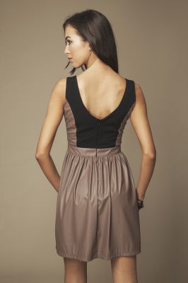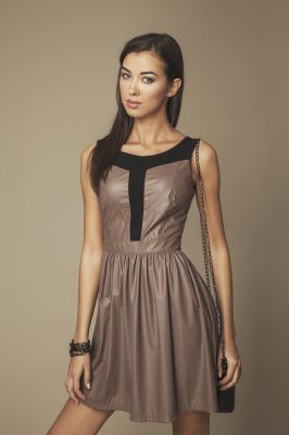 Sukienka wykonana z wysokiej jakości materiału skóropodobnego połączona z elastyczną tkaniną. W okolicach biustu liczne przeszycia. W okolicach pasa marszczenie, nadające wyrazu sukience. Z tyłu wcięcie i zapinanie na suwak.