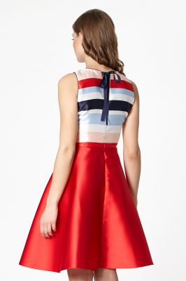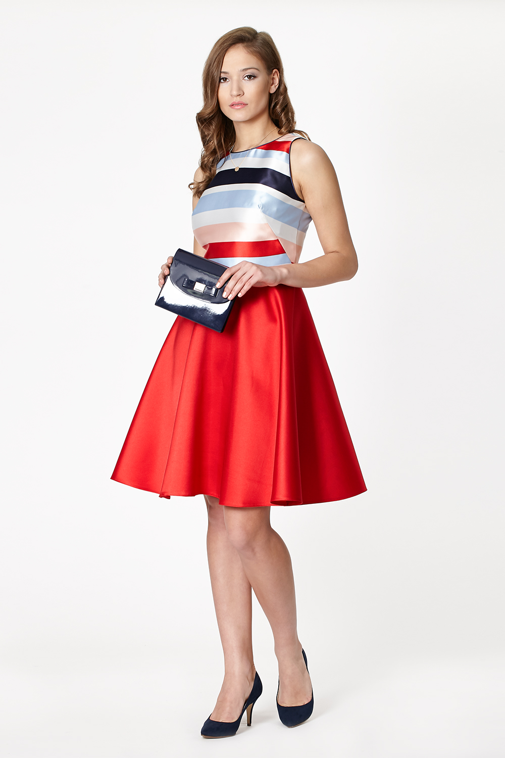 Wizytowa sukienka z górą w kolorowe pasy i rozkloszowanym dołem w kolorze czerwonym, wykonanym z koła. Z tyłu dekolt dodatkowo wiązany jest szarfą.