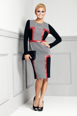 Kobieca sukienka z geometrycznymi wzorami. Oryginalne połączenie wzorów i kolorów.
