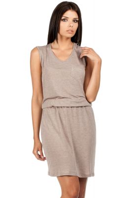 Gładka sukienka w kolorze cappuccino z gumką w pasie, bez rękawów. Dekolt w serek. Na piersi kieszonka. Idealna na upalne dni.