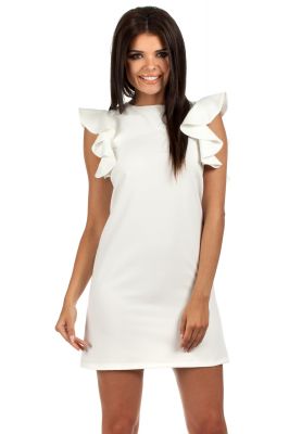 Prosta, gładka mini sukienka bez rękawów. Przy ramionach ozdobne falbany. Z tyłu, przy dekolcie zapięcie