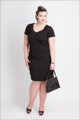 Prosty fason sukienki wykonanej z tkaniny o efekcie płatków, wycinanych laserowo. Niebanalny wzór przyciąga uwagę, a zastosowanie oryginalnego biżuteryjnego wykończenia z tyłu nadaje stylu glamour. Dekolt wykończono eleganckim kołnierzem. Jest to sukienka na podszewce z dodatkiem lycry z 2-óch rodzajów materiałów: przód wykonanyz tkaniny ozdobnej w płatki, na podkładzie z elastycznej dzianiny, tył i rękawy z dzianiny elastycznej.