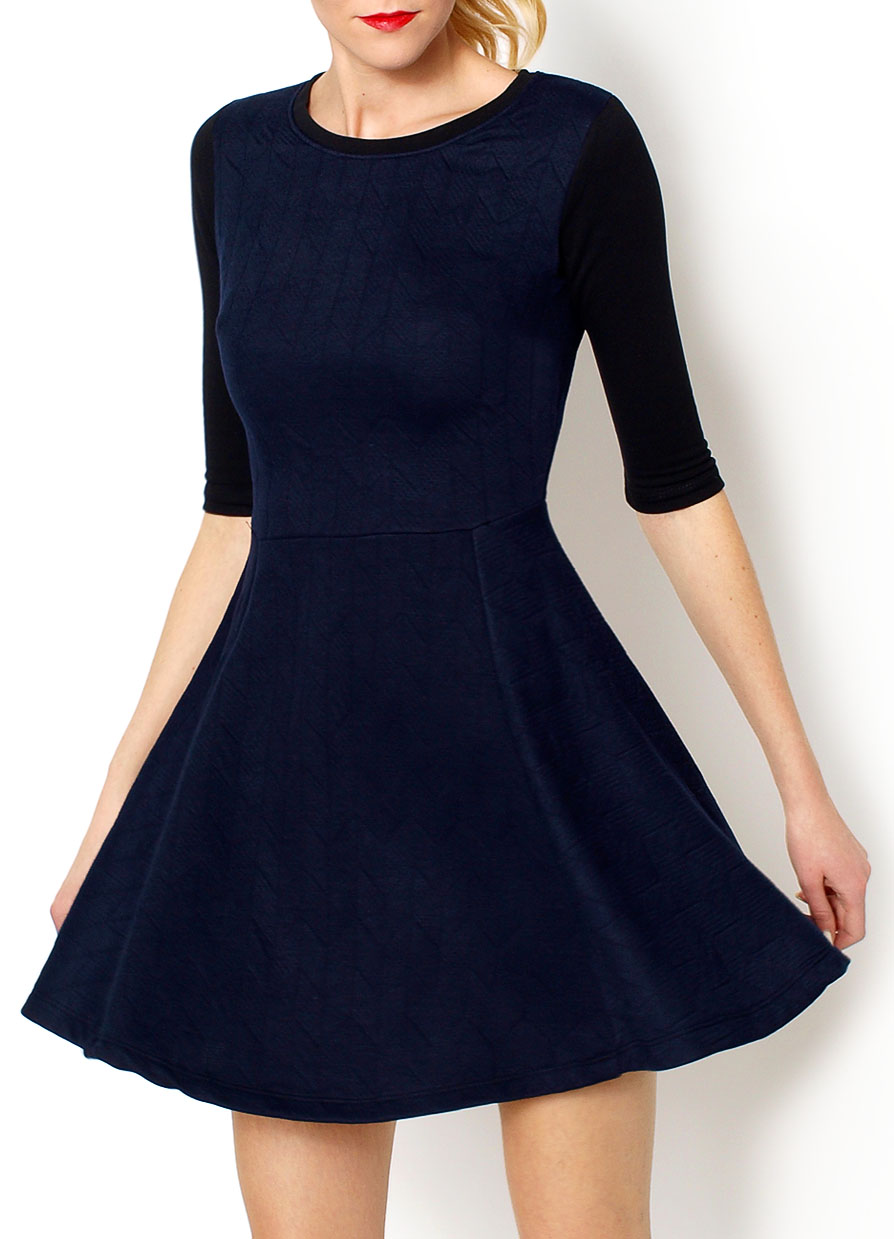 Sukienka, fason rozkloszowany,dekolt okrągły, wytłaczany wzór, rękaw 3/4, lamówka wokół dekoltu i rękawy gładkie i jednolite.Materiał 60% bawełna, 30% poliester, 10% lycra.Modelka wzrost 175cm, na co dzień nosi S/M, rozmiar z prezentacji produktu S/M.