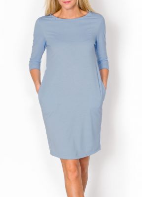 Gładka sukienka typu tuba z kieszeniami. Wykonana z bawełnianego materiału dobrego gatunkowo, ładnie układającego się na ciele. Rękawy o długości 3/4. Dekolt okrągły. Bez nadruków i wzorów. Charakterystycznie dla modelu kieszenie i wymodelowane biodra, podkreślające kształt sylwetki. Do wyboru kolory modne w sezonie. Produkt polski.Sukienka będzie doskonałym wyborem na co dzień np. do pracy, jak i bazą dla stylizacji na specjalne okazje, spotkania i wyjścia. Ołówkowy kształt atrakcyjnie prezentuje się na sylwetce i jest bardzo wygodny.Materiał 95% bawełna, 5% lycra.Modelka wzrost 175cm, na co dzień nosi rozmiar S/M