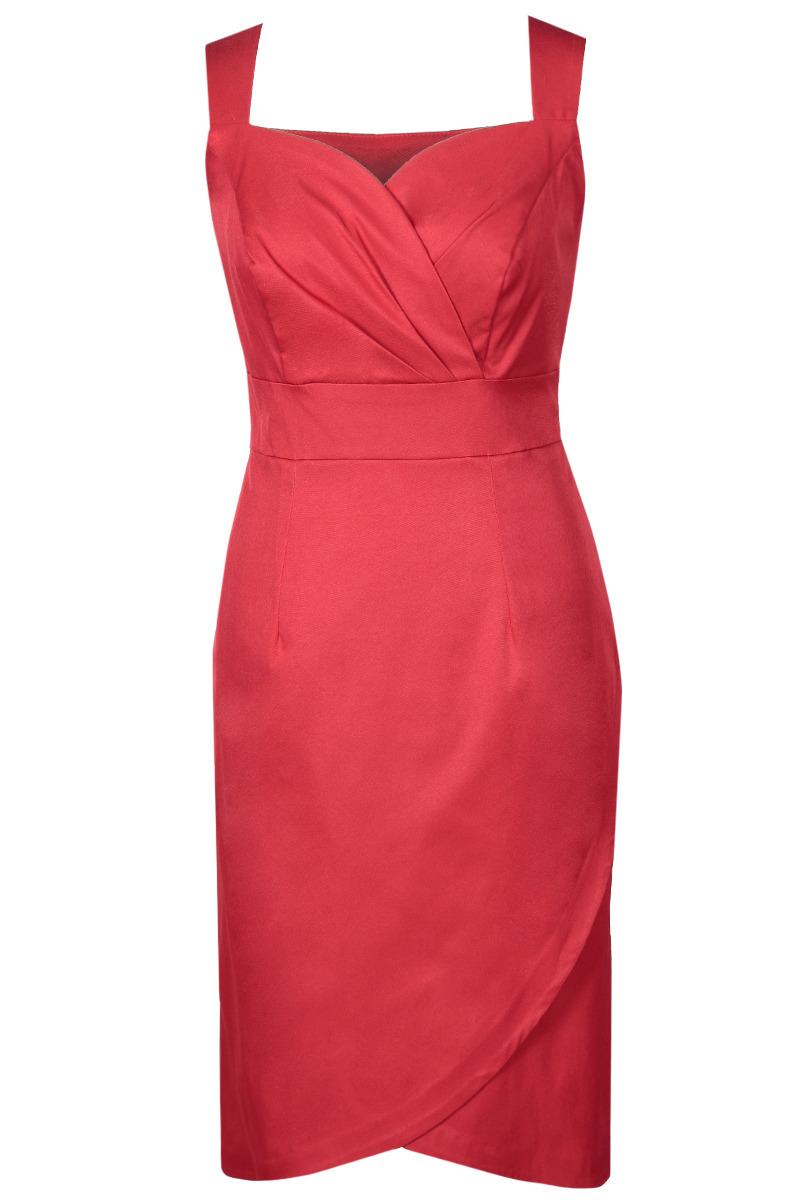 Elegancka sukienka ołówkowa z pięknym kopertowym dekoltem oraz tulipanowym dołem. Zapinana na kryty suwak na boku.