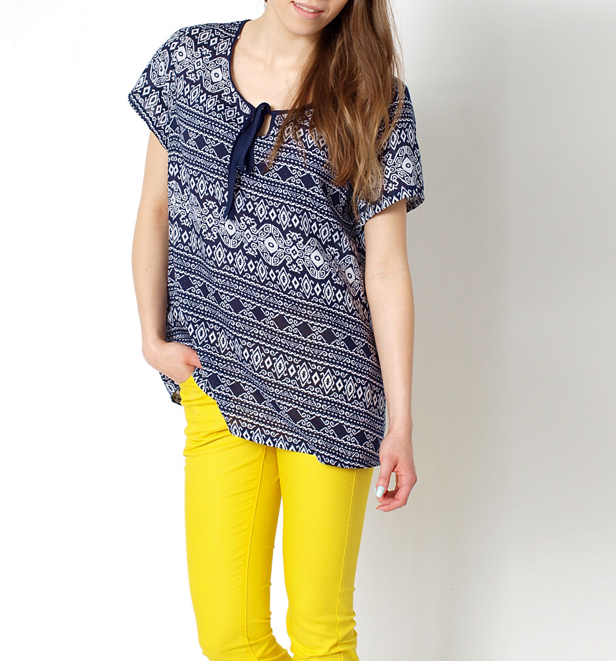 Bluzka w ciekawe azteckie wzory. Lekka, wykonana z oddychającej bawełny. Bluzka z krótkim rękawem. Dekolt okrągły wykończony lamówką, którą można zawiązać w nad biustem w zalotna kokardkę. Oryginalnie prezentuje się na sylwetce. Wygodna i bardzo praktyczna.Skład: 100% bawełnaWzrost modelki: 172cmModelka ma na sobie: rozmiar z metki MNa co dzień nosi rozmiar: S/M