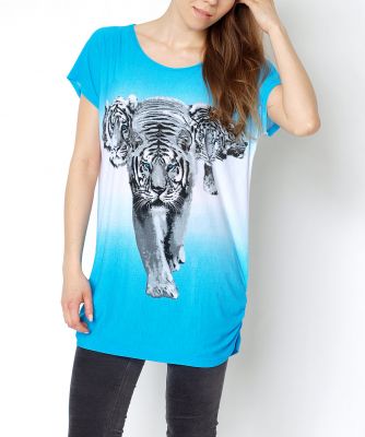 Rewelacyjna cieniowana bluzka. Bardzo subtelne połączenie bieli z najmodniejszymi kolorami tej wiosny oraz nadchodzącego lata. Tunika w stylu ombre, z modnym printem z motywem zwierzęcym. Klasyczny, prosty krój. U dołu, po bokach drapowania podszyte gumeczką. Dekolt okrągły. Materiał lekki, elastyczny, o ciekawej fakturze. Świetnie sprawdzi się noszona do legginsów. Fantastycznie prezentuje się na sylwetce.Skład: 65% bawełna, 35% poliester.Wzrost modelki: 172cmNa co dzień nosi rozmiar: S/M