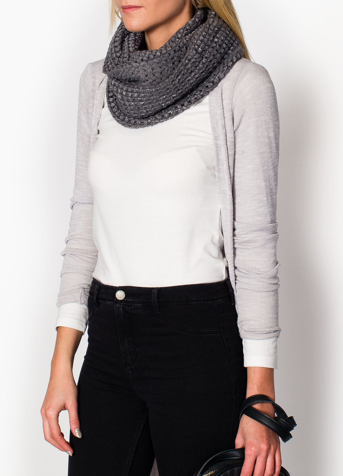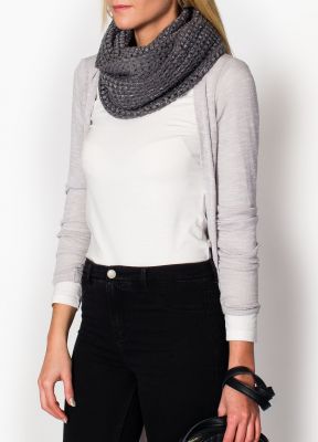 Gruby, bardzo ciepły komin o ciekawym splocie zdobiony błyszczącymi cekinami. Wkładany przez głowę szal w formie tuby/tunelu. Przyjemny w dotyku. Dostępny w najmodniejszych w tym sezonie kolorach.Materiał 100% wiskoza