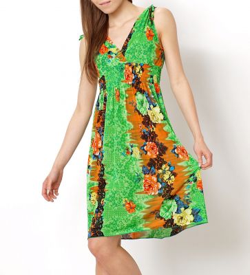 Kolorowa, letnia sukienka. Dostępna w pięknych, soczystych kolorach. Dekolt kopertowy. Marszczenia pod biustem idealnie dopasowują się do ciała. Dół rozkloszowany, zwiewny. Na ramionach ściągana sznureczkami, które można zawiązać w efektowne kokardki. Motyw floral pasuje na każdą okazję, a także podkreśli dziewczęcy urok. Wygodna i bardzo komfortowa sukienka, idealna na ciepłe oraz upalne letnie dni.Skład: 65% bawełna, 35% poliester.