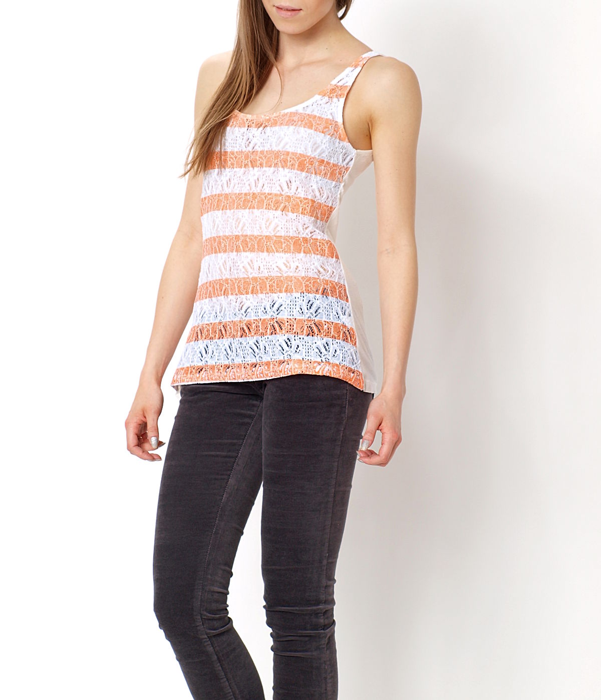 Śliczna koronkowa bokserka w paski. Przód z koronki w piękny kwiatowy deseń. Tył z delikatnego, zwiewnego materiału. Ładnie układa się na sylwetce. Doskonale prezentuje się z legginsami, letnimi szortami i spódniczkami. Lekka bluzeczka idealna na ciepłe, letnie dni. Skład: 80% bawełna, 15% poliester, 5% elastan.Wzrost modelki: 172cmModelka ma na sobie: rozmiar z metki S/MNa co dzień nosi rozmiar: S/M