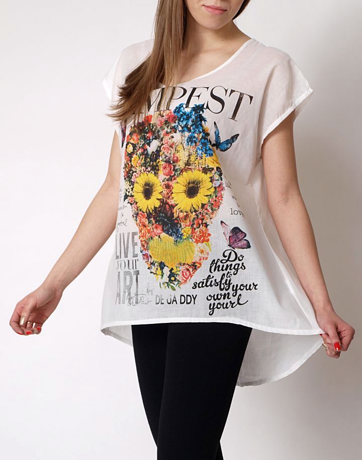 Asymetryczna bluzka bez rękawów. Delikatnie dłuższy krój bluzki z tyłu, bardzo modny tej wiosny. Bawełniana koszulka z kolorowym nadrukiem z przodu. Tył gładki. Dekolt okrągły. Luźna i bardzo wygodna. Idealna np. do gładkich legginsów, jak i klasycznych jeansów.Skład: 100% bawełna