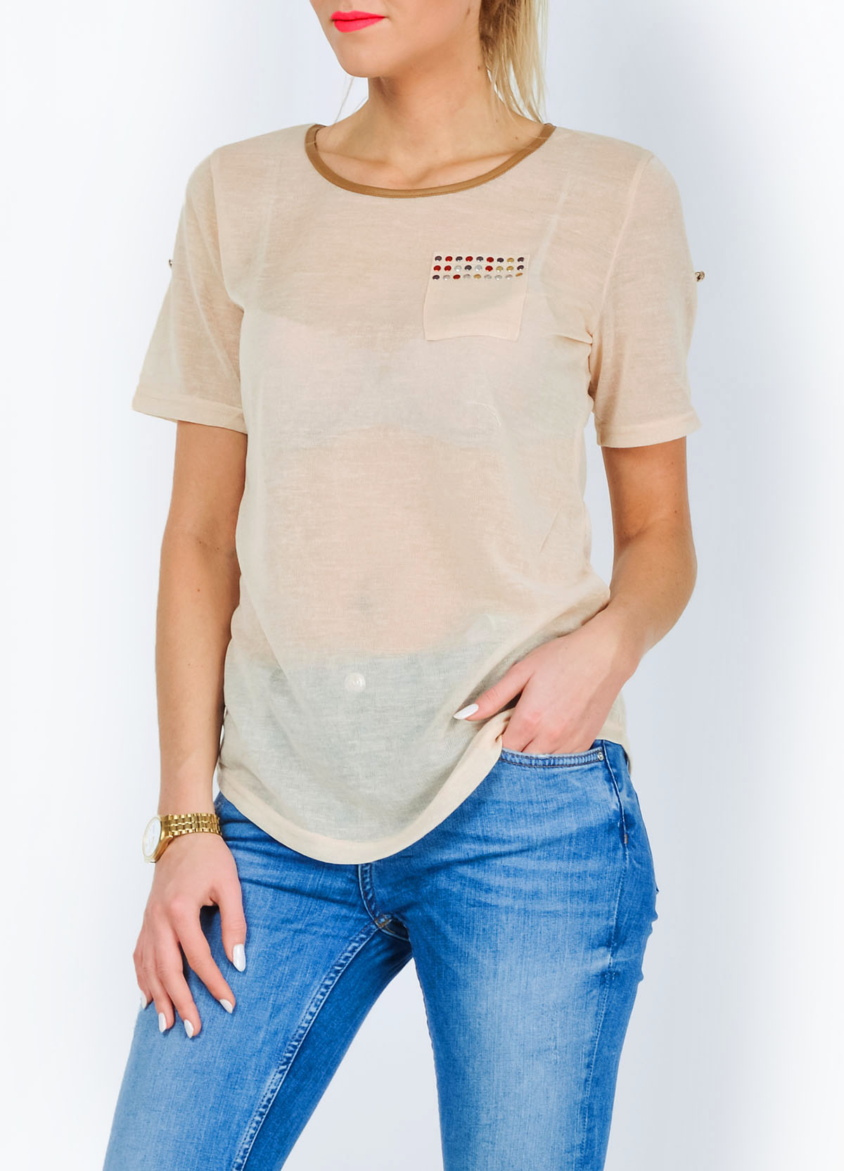 Bawełniana, bardzo wygodna bluzeczka z krótkim rękawem. Wykonana z miękkiego, półprzezroczystego materiału. Na wysokości piersi kieszonka z kolorowymi dżetami. Dekolt wykończony lamówką a`la skóra. Koszulka idealna np. do jeansów, jako uzupełnienie codziennego stylu. Dostępna w wielu modnych kolorach.Skład: 65% bawełna, 35% poliester.