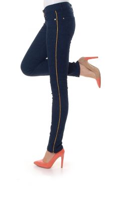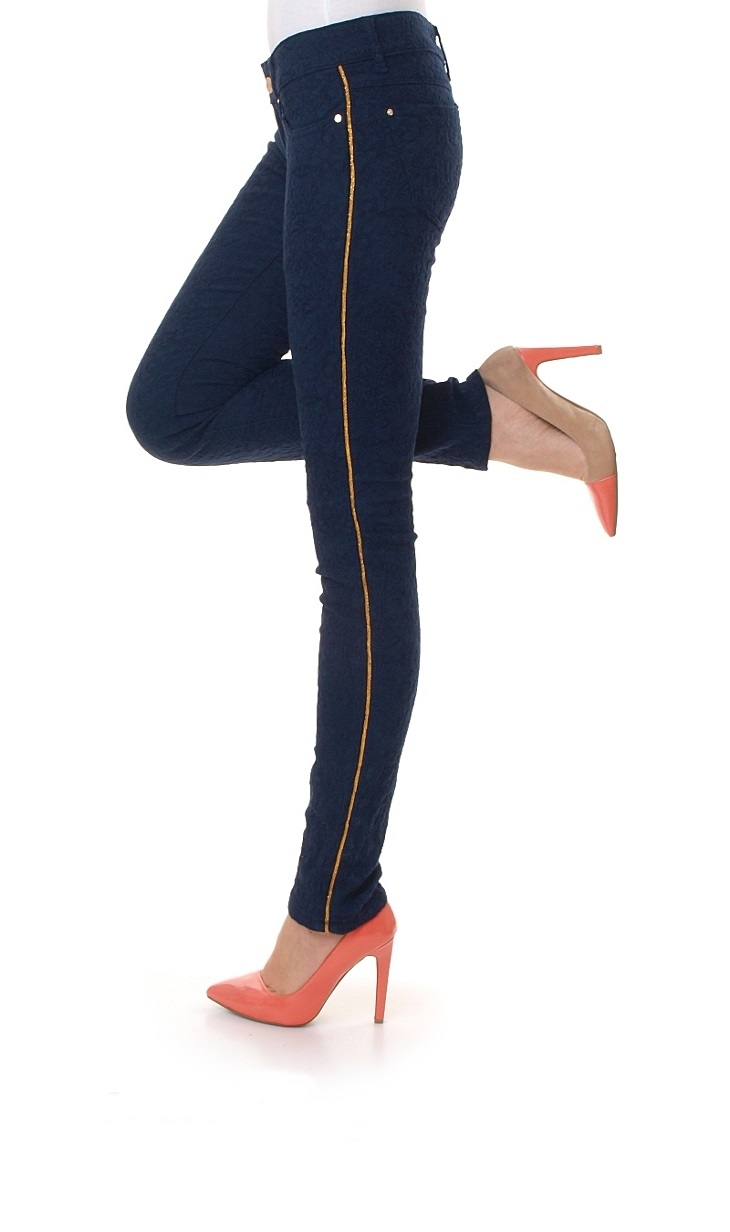 Seksowne, koronkowe / ażurowe biodrówki ze złotym paseczkiem z boku wzdłuż nogawki, który optycznie wydłuża nogę. Dopasowane, wyszczuplające, bawełniane rurki z kieszeniami z przodu i z tyłu. Zapinane na guzik i zamek. Spodnie posiadają w pasie szlufki, dzięki czemu możliwa jest stylizacja z paskiem. Modne, pomysłowe, cygaretki. Miękkie i przyjemne w dotyku bryczesy.Skład: 70% bawełna, 27% poliester, 3% elastan