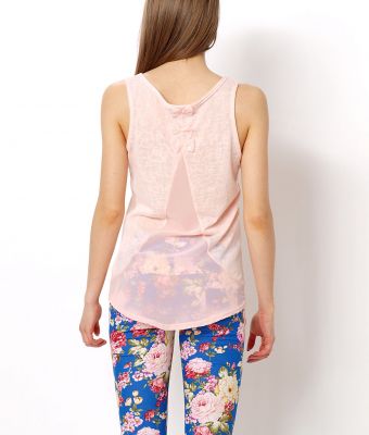 Śliczny top z ozdobnymi plecami. Bluzka bez rękawów z szyfonową wstawką z tyłu. Dodatkowo plecy zdobione kokardkami, które nadają całości dziewczęcego uroku. Bluzka wykonana jest z przyjemnego materiału o cieniowanej, półkryjącej fakturze. Ładnie układa się na sylwetce. Bardzo praktyczna. Pasuje do wielu zestawień. Pasuje na wiele okazji, jak również noszona na co dzień, np. do legginsów. Skład: 65% bawełna, 35% poliester.Wzrost modelki: 172cmModelka ma na sobie: rozmiar z metki M/LNa co dzień nosi rozmiar: S/M
