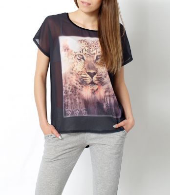 Wyjątkowa bluzka mgiełka z najmodniejszym w tym sezonie nadrukiem z motywem zwierzęcym. Rękawy krótkie. Tył gładki, asymetryczny, wykonany z mięciutkiego, elastycznego materiału z dodatkiem sztucznego jedwabiu. Z przodu półprzeźroczysta mgiełka. Dekolt okrągły, wykończony lamówką. Świetnie sprawdzi się noszona do legginsów. Tunika ładnie układa się na sylwetce. Dzięki oryginalnemu wzornictwu, jest obowiązkową pozycją, dzięki której każda stylizacja zyska niepowtarzalnego charakteru.Skład: 100% poliester / 95% sztuczny jedwab, 5% spandex.Wzrost modelki: 172cmModelka ma na sobie: rozmiar z metki L/XLNa co dzień nosi rozmiar: S/M