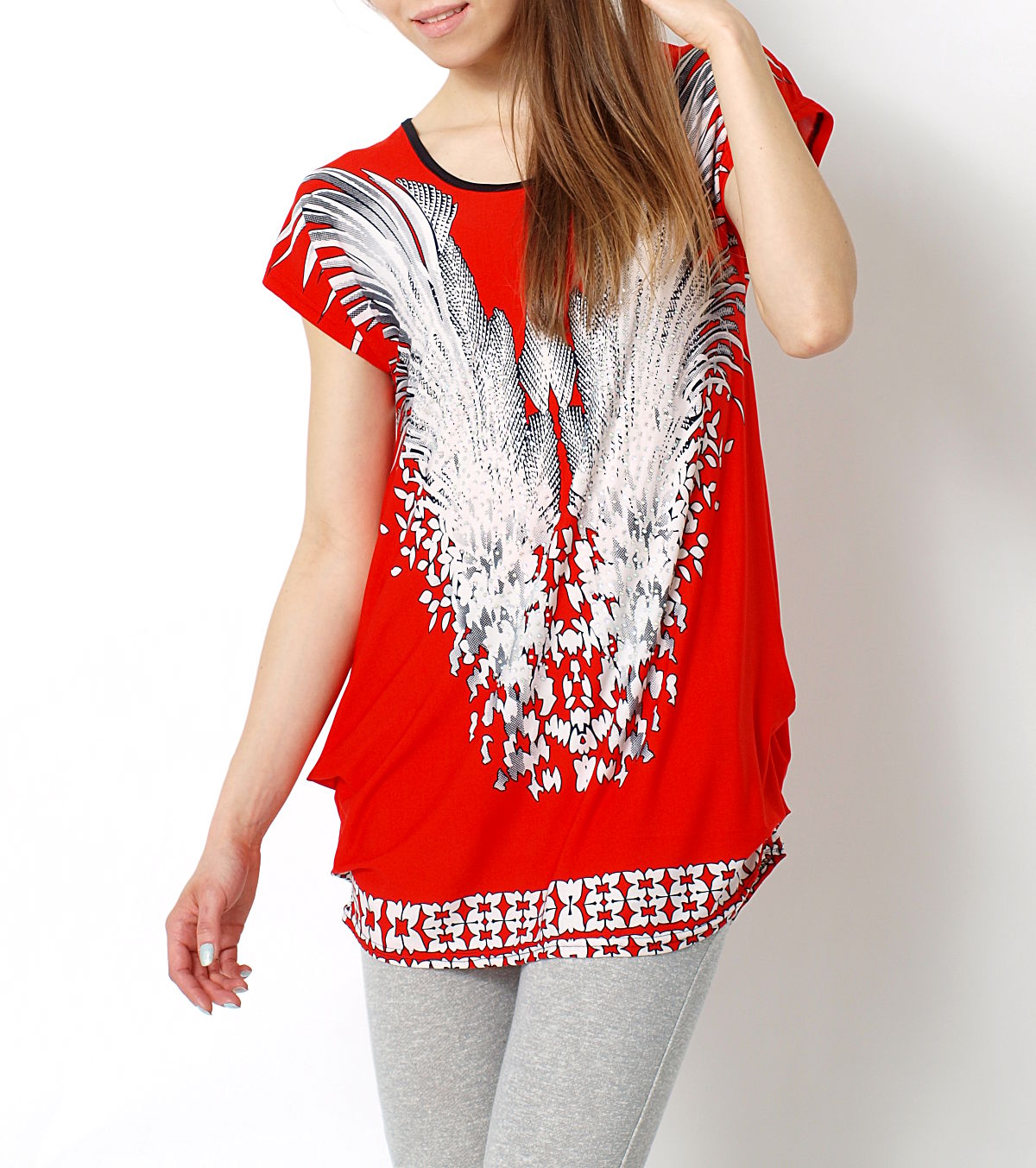 Wiosenna tunika w eleganckim stylu. Zdobiona niepowtarzalnym printem z dyskretnie połyskującymi cyrkoniami. Długa bluzka z krótkim rękawkiem. Dekolt okrągły, wykończony lamówką. Po bokach, na dole, marszczenia, przez który bluzka zyskuje ciekawy fason. Bardzo wygodna i komfortowa. Świetnie sprawdzi się noszona na wiele okazji. Dostępna w soczystych, zdecydowanych kolorach.Skład: 65% bawełna, 35% poliesterWzrost modelki: 172cm Na co dzień nosi rozmiar: S/M
