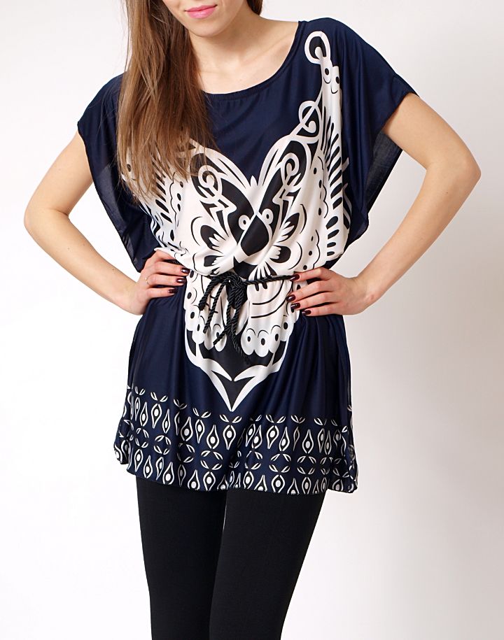 Wyjątkowa bluzka z krótkim rękawem. Wzorzysta tunika wiązana w talii sznureczkiem. Wykonana z półmatowego, przyjemnego materiału dobrego gatunkowo. Ładnie układa się na sylwetce. Idealna pozycja na stworzenie niezwykle efektownej i modnej stylizacji.
