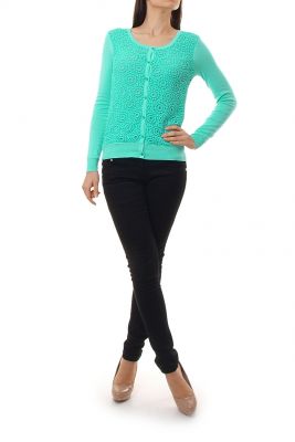 Bawełniany sweterek z ażurowymi oraz koronkowymi wstawkami z przodu oraz na plecach. Zapinany na guziczki. Dół oraz rękawy wykończone delikatnymi ściągaczami. Kardigan wykonany z miłego w dotyku materiału. Dostępny w modnych kolorach.Skład: 65% bawełna, 35% poliester