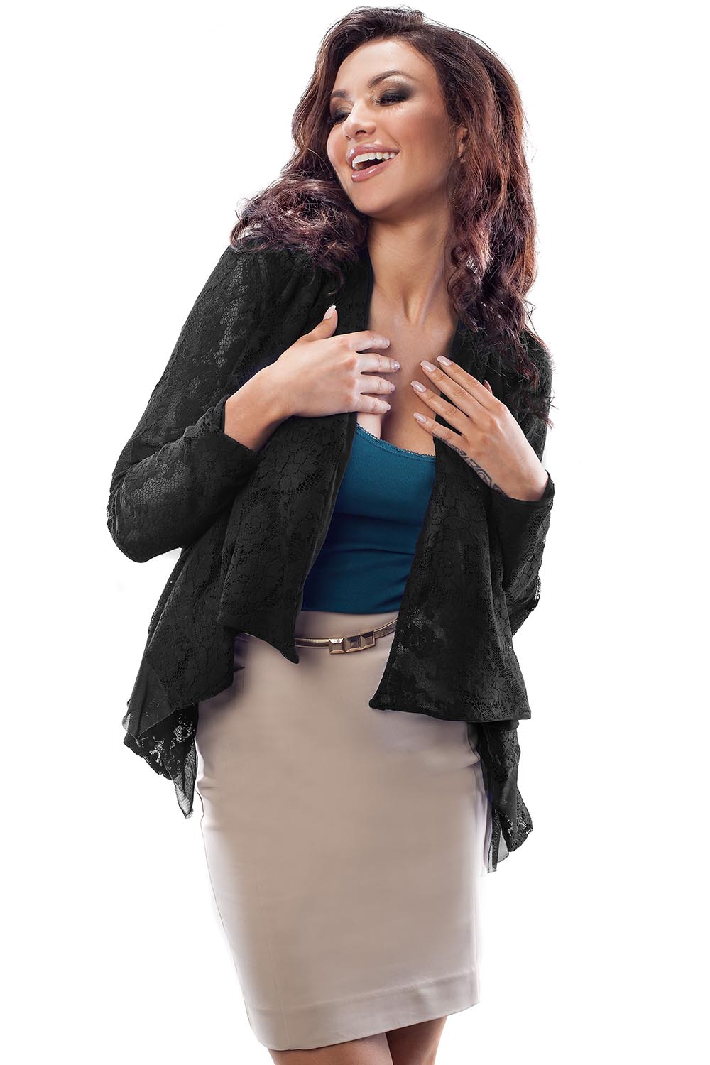 Efektowna, wizytowa narzutka z koronki, wykończonej u dołu ciekawym detalem w postaci gładkiej dzianinowej siateczki. Swobodny fason idealny do wieczorowej sukienki. Narzutka posiada długi rękaw.